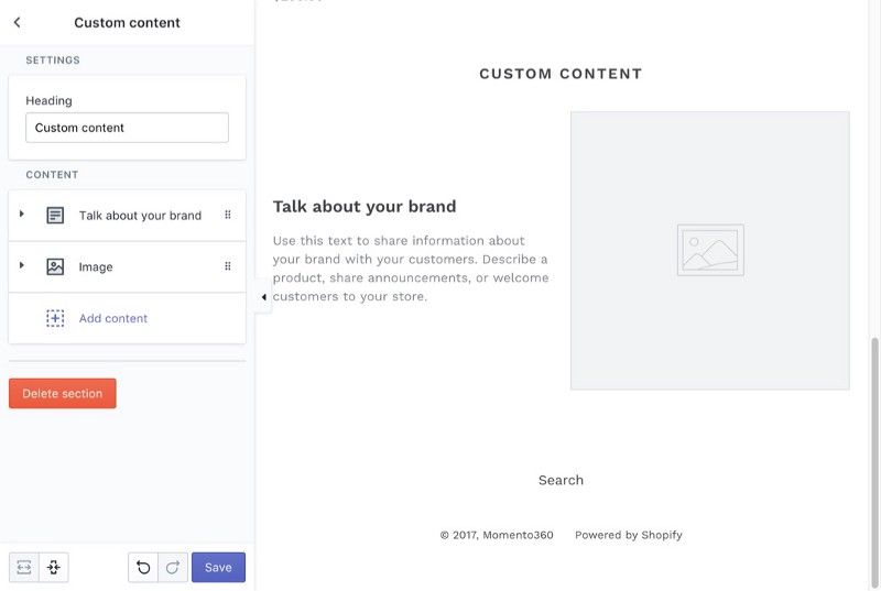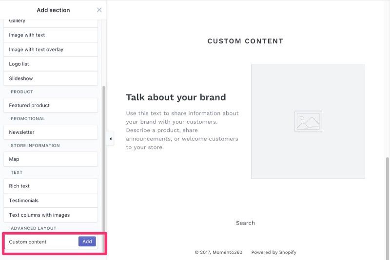 On the page you want to add the 360 to, click “Add Section” and select “Custom Content” at the very bottom of the menu that appears: