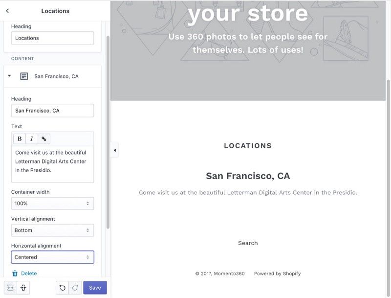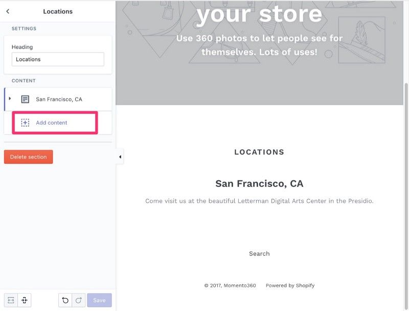Add the information you want. Here we’re going to add a Location section to our hypothetical store so that potential customers can see the beautiful locale.