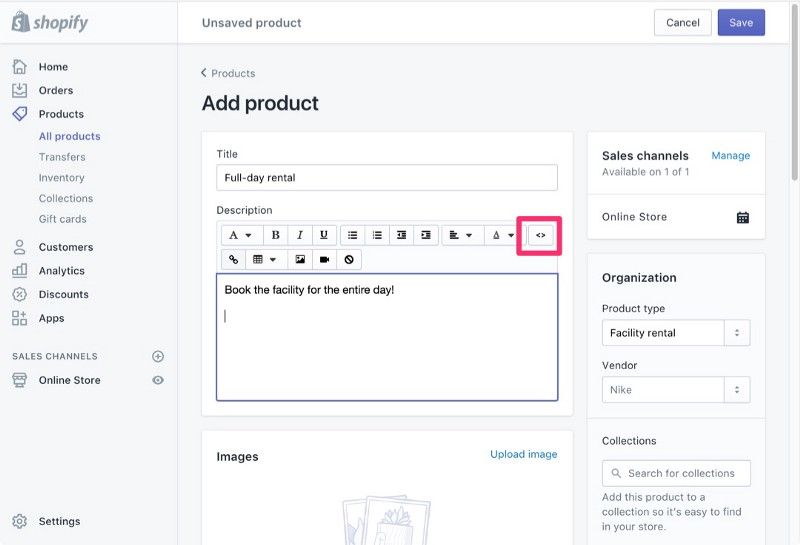 To add a 360 to a product listing, go to the Product’s detail page, and click the “<>” button in the toolbar of the Description field: