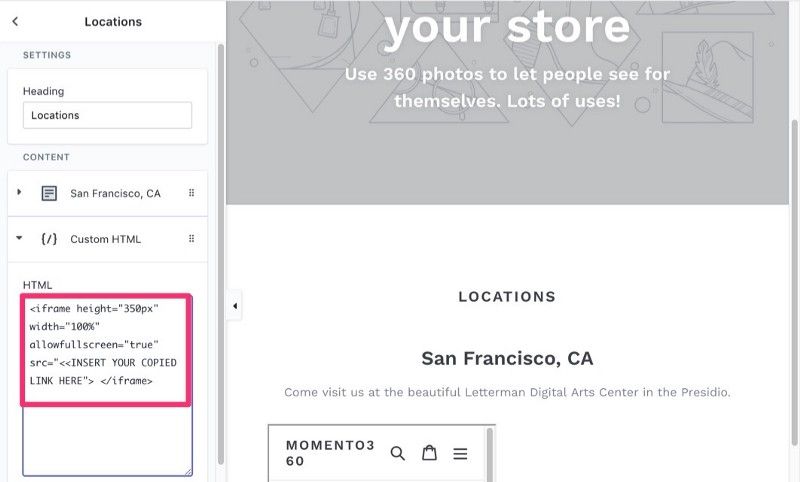 Next, take the link that you copied from Momento360 in Step 5, and replace the <<INSERT YOUR COPIED LINK HERE>> text with it. You’ll see the preview update accordingly. (Optional: If you want to adjust other options, like the height or width of the image frame, change the height and width values too.)