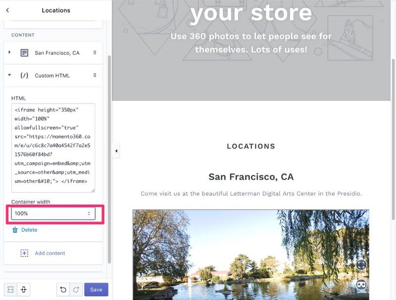 If you want the 360 to go the full width of the page, set the “Container Width” dropdown to 100%. The preview will update accordingly.