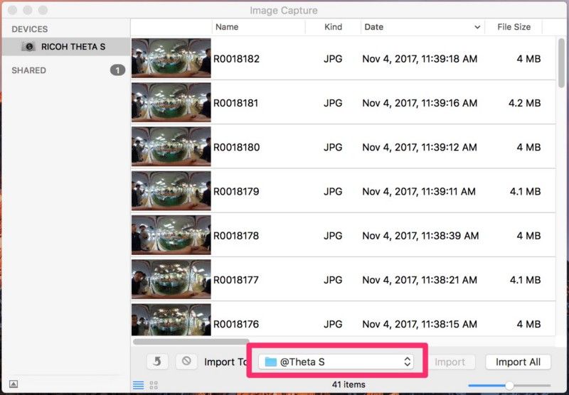 It helps if you have one folder that you keep all your 360 images since Image Capture will try and show when you’ve already downloaded a photo/video (in our experience this works some of the time, and not others).