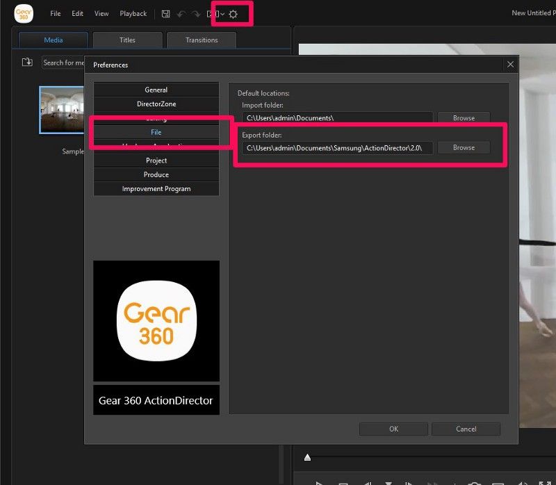 Access this via the Preferences menu (the gear icon, see below). Then under “File” set “Export folder:” to where you want your processed/stitched 360s to be saved.